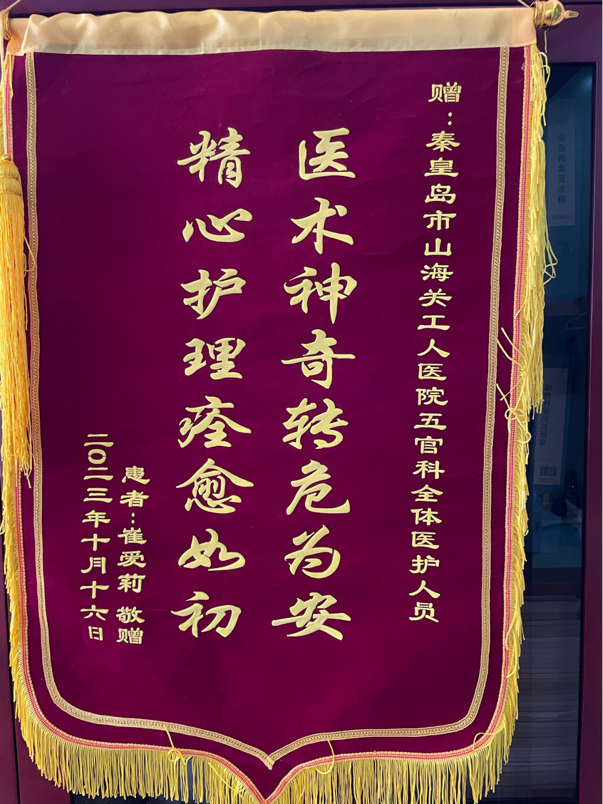 近日,在秦皇島市工人醫(yī)院眼耳鼻喉科,一位急性會(huì)厭炎痊愈的患者和家屬激動(dòng)地握著醫(yī)生的手說(shuō):“感謝你們,是你們精湛的醫(yī)術(shù)救了我的命”,并將一面寫有“醫(yī)術(shù)神奇轉(zhuǎn)危為安 精心護(hù)理痊愈如初”的錦旗遞到醫(yī)護(hù)人員的手里。