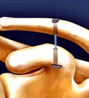 對(duì)于肩鎖關(guān)節(jié)脫位,傳統(tǒng)手術(shù)常常使用鎖骨鉤鋼板固定,一端固定鎖骨,另一端固定在肩峰下。不過,這種手術(shù)創(chuàng)傷比較大,而且鉤子在肩峰下長時(shí)間隨人體活動(dòng),會(huì)因?yàn)榉磸?fù)摩擦破壞骨質(zhì),可能導(dǎo)致肩關(guān)節(jié)疼痛、肩關(guān)節(jié)活動(dòng)受限、肩袖磨損、肩峰撞擊綜合征、再脫位等后果且活動(dòng)受限。所以一般來說放置的時(shí)間不能太長,半年左右之后就需要二次手術(shù)取出鋼板。