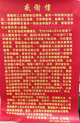 患者王先生家屬寫(xiě)表?yè)P(yáng)信感謝普外一科全體醫(yī)護(hù)人員