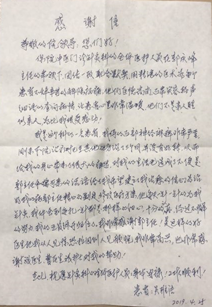患者吳女士寫(xiě)感謝信感謝中醫(yī)科郭慶峰主任及科室全體醫(yī)護(hù)人員