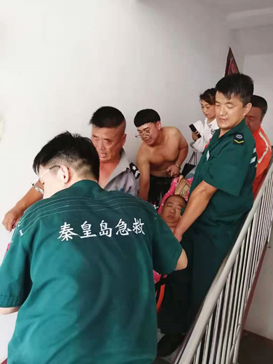 7月22日12時40分,秦皇島市工人醫(yī)院120的警鈴?fù)蝗豁懫,呼救原因(yàn)樽蟀肷頉]有知覺,頂著午間33度高溫,醫(yī)護(hù)人員迅速出警;颊啐R某,男性、39歲,已發(fā)病4小時,醫(yī)生護(hù)人員迅速查看患者神志狀況和生命體征,血壓高達(dá)190/100mmHg,瞳孔向一側(cè)凝視、伴噴射性嘔吐、頭痛劇烈、身體偏癱,初步診斷為腦出血。由于患者偏胖,約300斤,擔(dān)架工立刻和院醫(yī)護(hù)人員,4人合力將患者從6樓抬到救護(hù)車上。